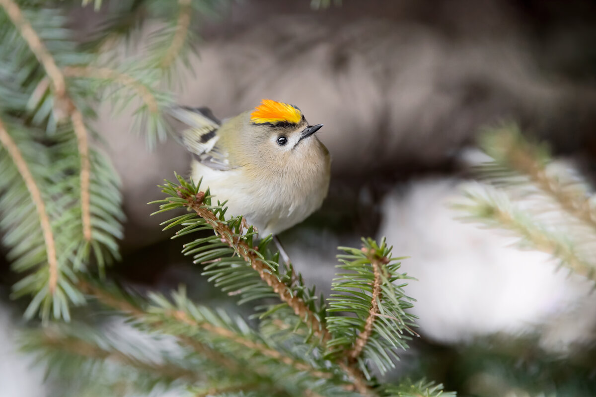 Très actif, le roitelet huppé vole en tous sens pour trouver sa nourriture préférée : desinsectes et des araignées. Une vraie pile électrique ! Il préfère s’attaquer à des proies minuscules comme les collemboles, les pucerons, les larves ou les petits papillons de nuit. Il inspecte minutieusement les branches de conifères et sa petite taille lui permet d’accéder aux endroits les plus inaccessibles. Il peut même se suspendre dans des positions improbables grâce à ses doigts puissants. Il est aussi très ingénieux : il est capable de picorer les insectes pris dans les toiles d’araignées !